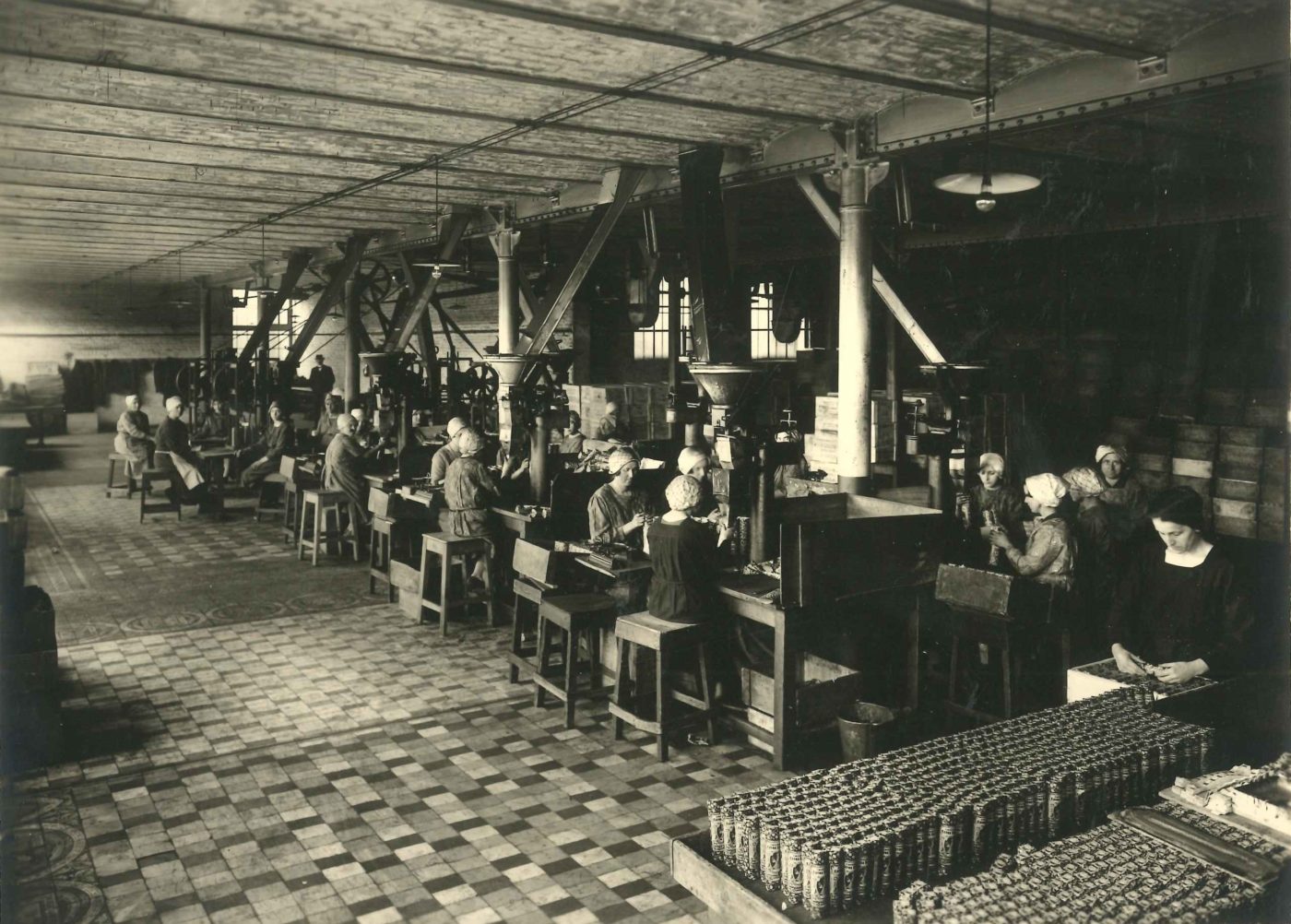 Foto collectie Leroux.Werknemers van het bedrijf Leroux verpakken de gebrande en gemalen cichorei in zakjes, klaar voor het transport.