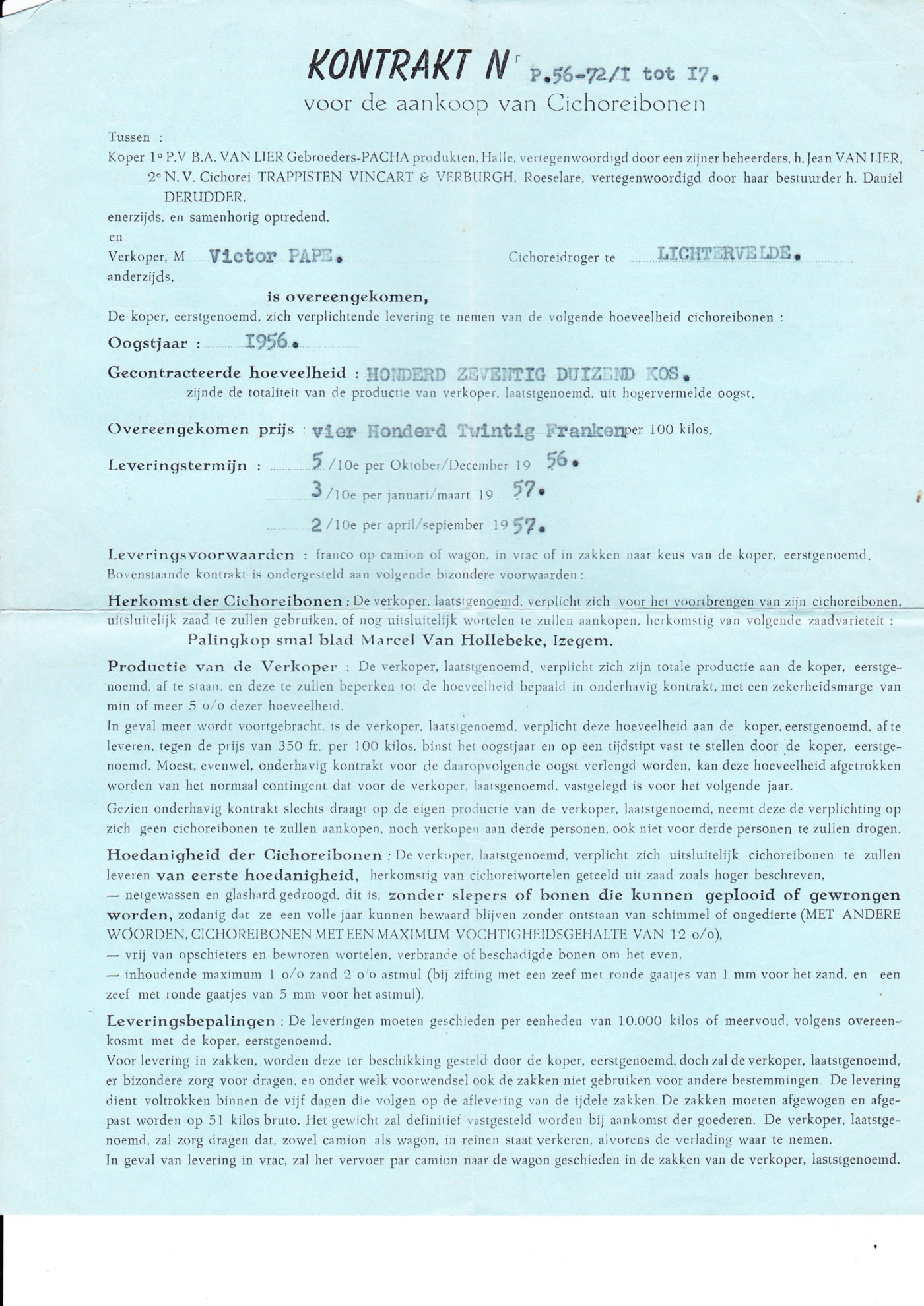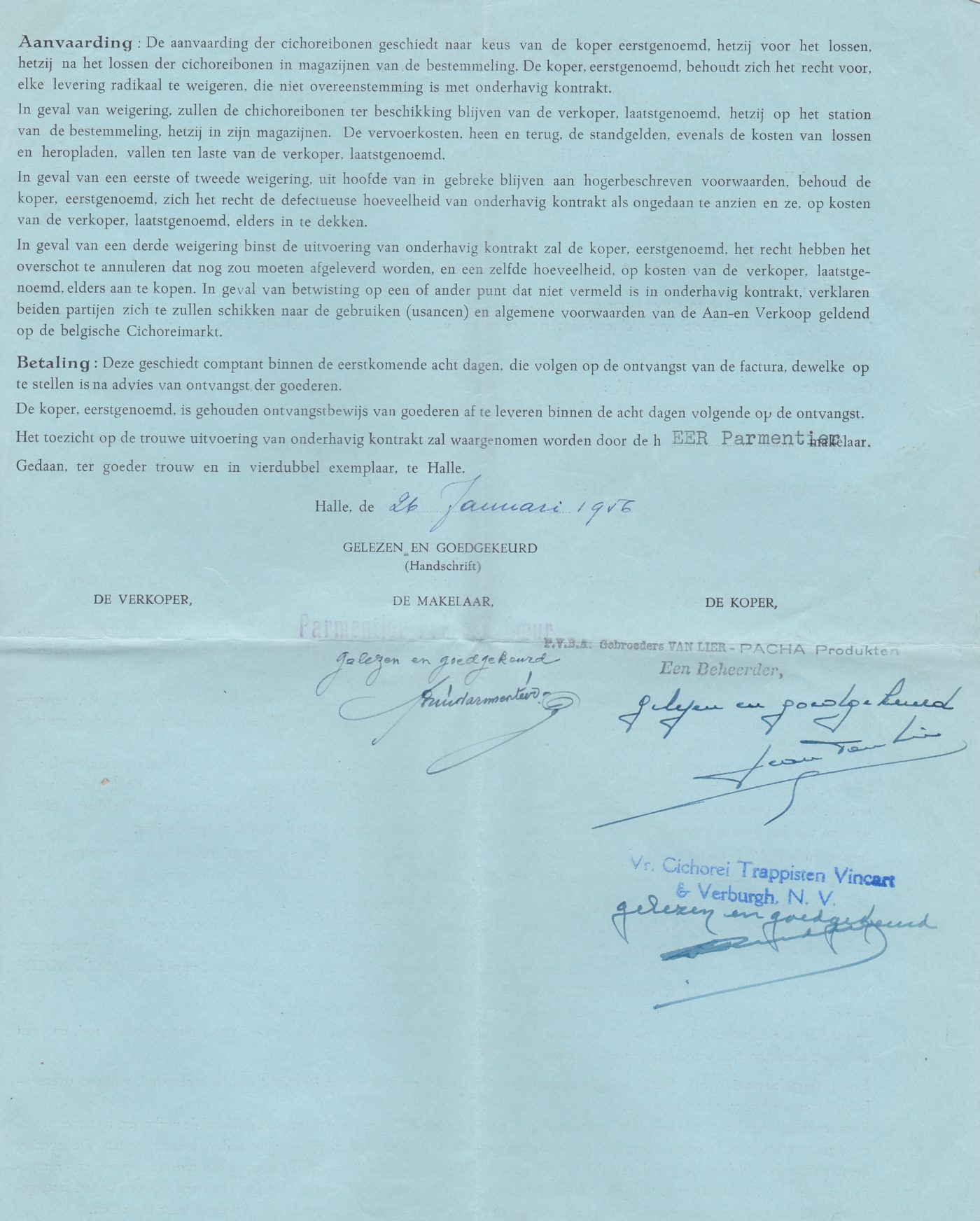 De verkoop van cichoreibonen (gedroogde cichorei) werd vaak georganiseerd door makelaars,  die de bonen verhandelden op basis van hun kwaliteit en  de beschikbare hoeveelheid, waarna werd besloten tot transportvoorwaarden, betaling en een verkoopscontract. De foto toont een verkoopscontract tussen een  eigenaar van een ast in Saint-Omer-Capelle en de makelaar Canone in 1954.