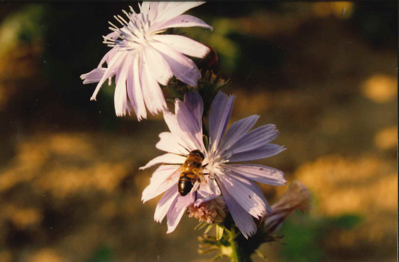 Collection Leroux. Des fleurs de chicorée sont en train d'être pollinisées par des insectes.