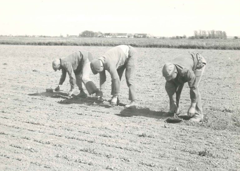 Oorspronkelijk duwden boeren kleine handmatige zaaimachines die één rij tegelijk in een "kraal" zaaiden (op gelijke afstand van elkaar). Deze kralen vormden lange lijnen op een afstand van 12 inch of 33 cm. Het gebruik van een zaaimachine, door een paard getrokken, liet toe om 4 en 6 rijen tegelijk te zaaien. De boeren kozen voor paarden, met smalle hoeven, zoals semi-race paarden. Die werden getraind om vooruit te komen door de poten op te heffen en zo de planten niet te verpletteren. "We zaaiden vroeg in de ochtend tot het donker werd, met vers zaad geproduceerd door kleine lokale producenten. "
