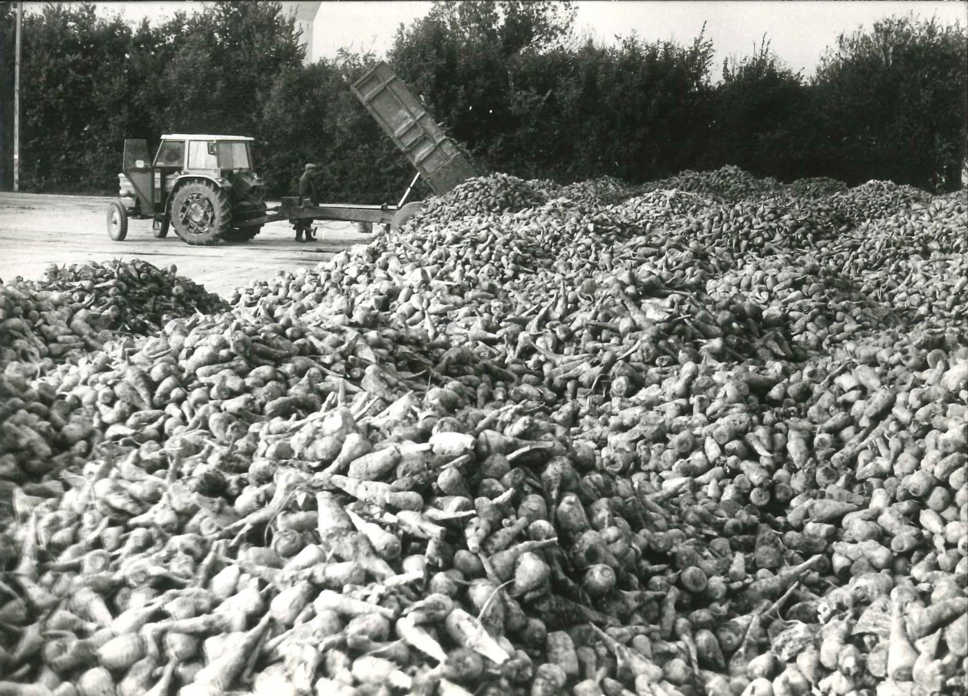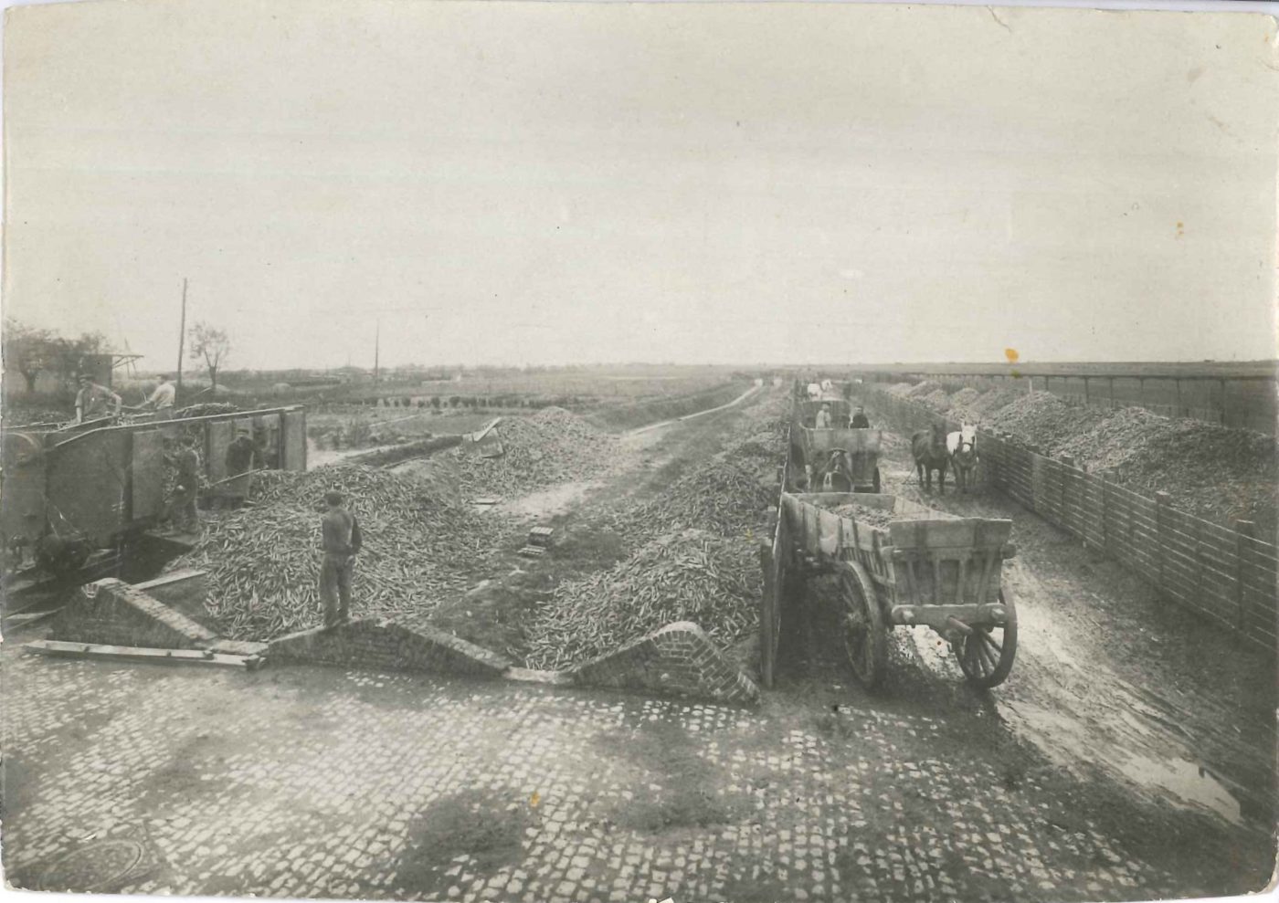 Des ouvriers déchargent à la main un tombereau traîné par des chevaux. Les racines sont alignées en tas le long d'un mur. Un tracteur actionne sa benne basculante, il a remplacé la traction animale puis les trains sont venus compléter les moyens de transport.