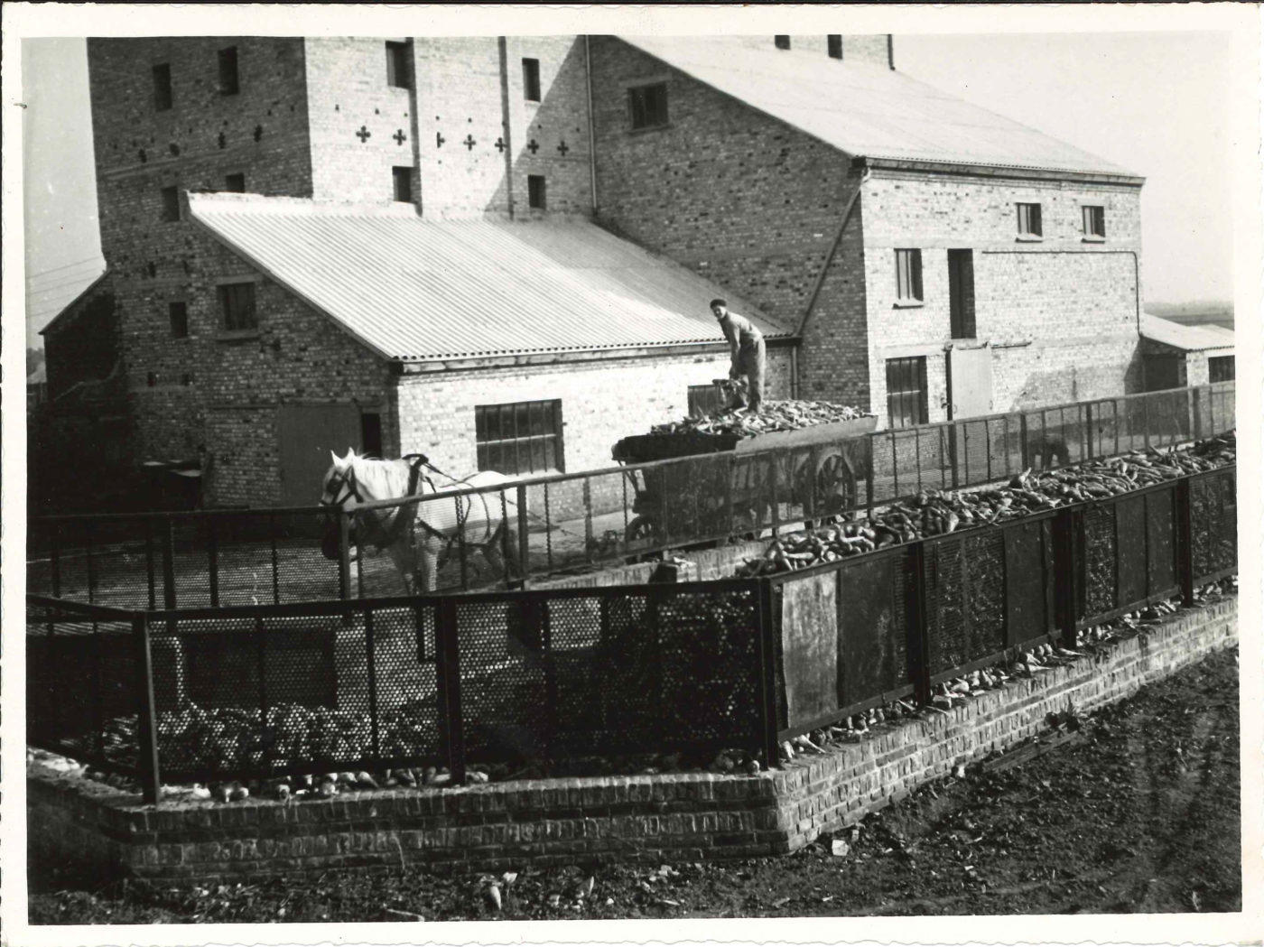 De arbeiders lossen de 'kipwagen',  getrokken door paarden.  De wortels worden gestapeld op hopen langs de muur.  Tegenwoordig gebeurt de aanvoer met een tractor. Die heeft de paarden vervangen.  Nog later kwamen de treinen om de vervoersmiddelen  te voltooien.