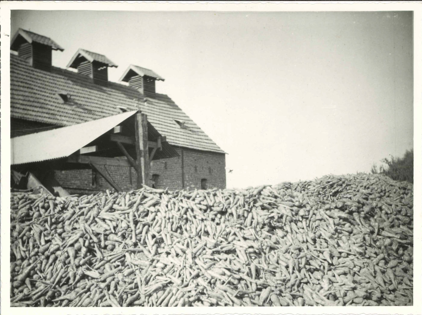 Les racines ont été pesées sur la bascule dont on voit l'emplacement sur la deuxième photo. Elles sont ensuite entassées sur le carreau devant la sécherie. Un courtier négocie l'achat des cossettes sèches avec le sécheur : qualité, tonnage, prix.