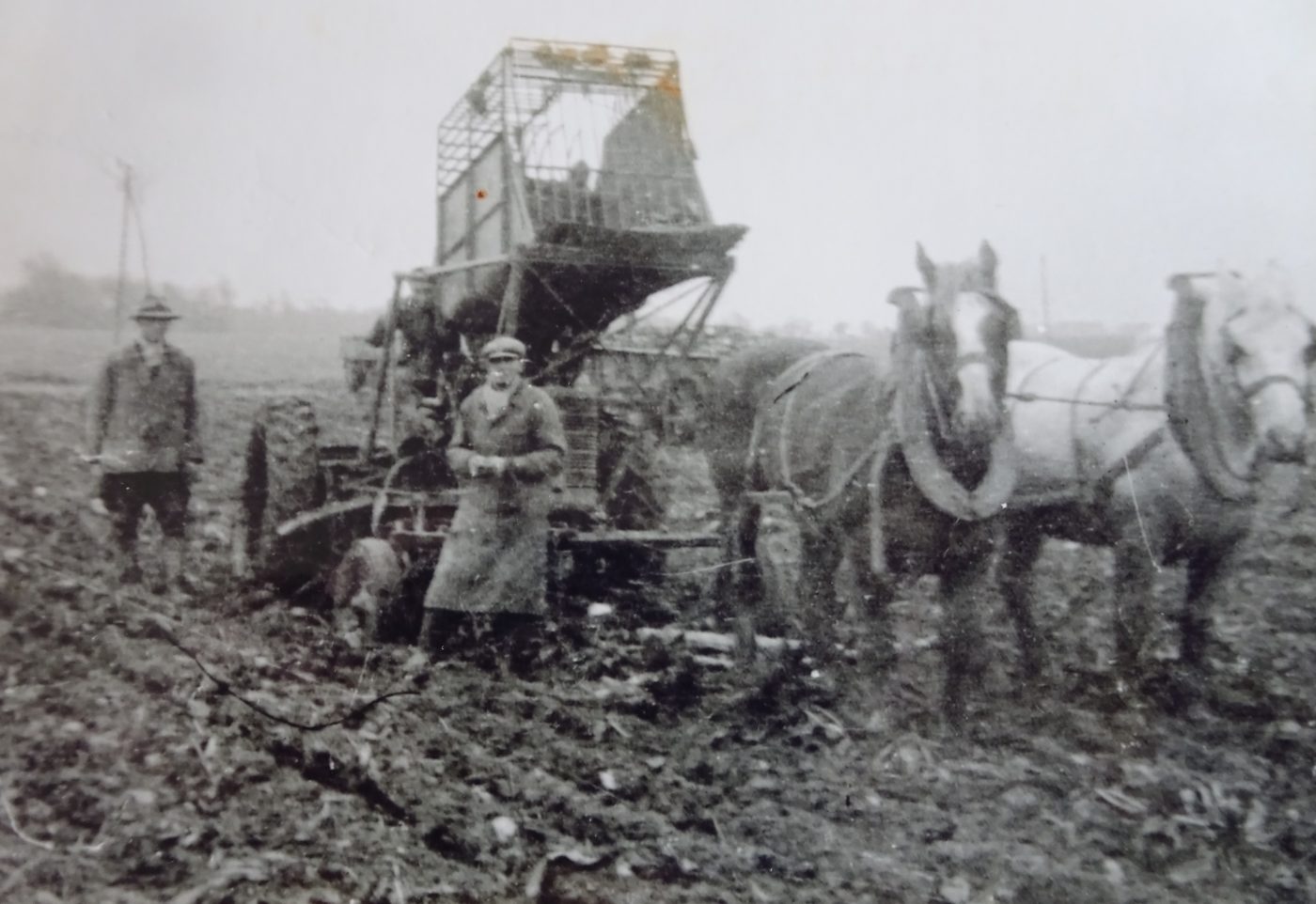 Photo collection Pierre Noël. Dans les années 60, apparaissent les premières arracheuses de chicorées mécaniques. Toujours tirées par des chevaux, elles permettent de récolter plus rapidement avec moins de main d'oeuvre.