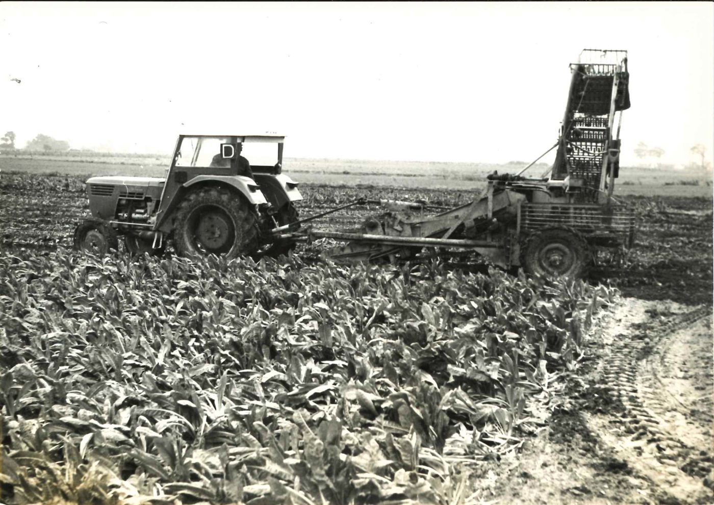 Foto collectie Leroux. In de jaren 1970 begonnen sommige boeren mechanische rooiers te gebruiken in combinatie met een tractor. Het werk wordt veel sneller gedaan en vereist veel minder arbeid.