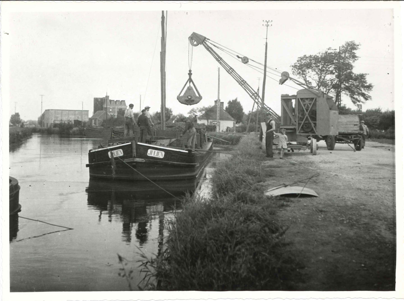 Les fours des sécheries étaient alimentés par du coke. Le plus souvent, il était transporté par voie fluviale. La photo montre le chargement d'une péniche à l'aide d'une grue. A l'arrivée, le coke était souvent déchargé par des grues mais parfois manuellement. C'était un travail extrêmement pénible.