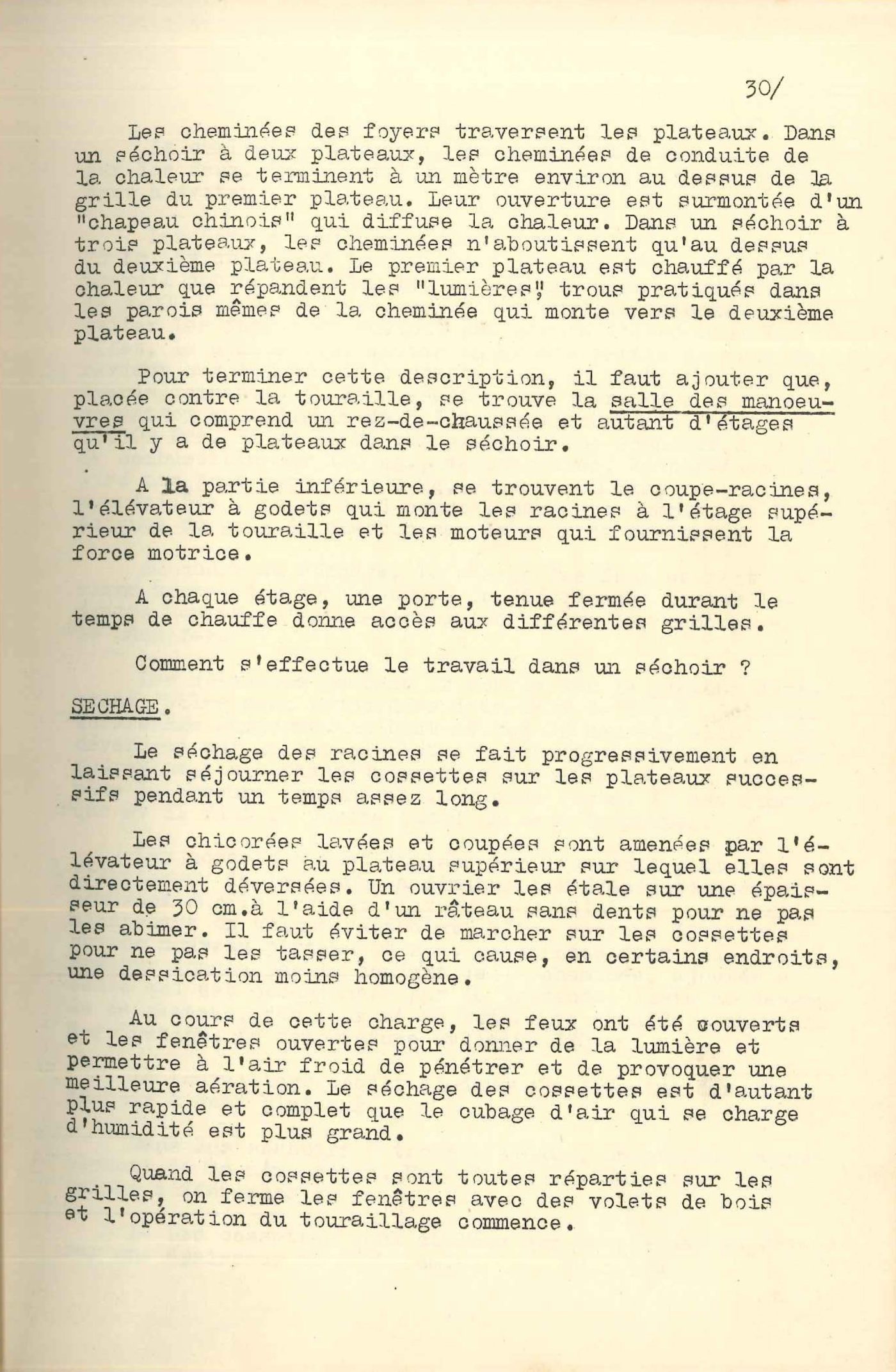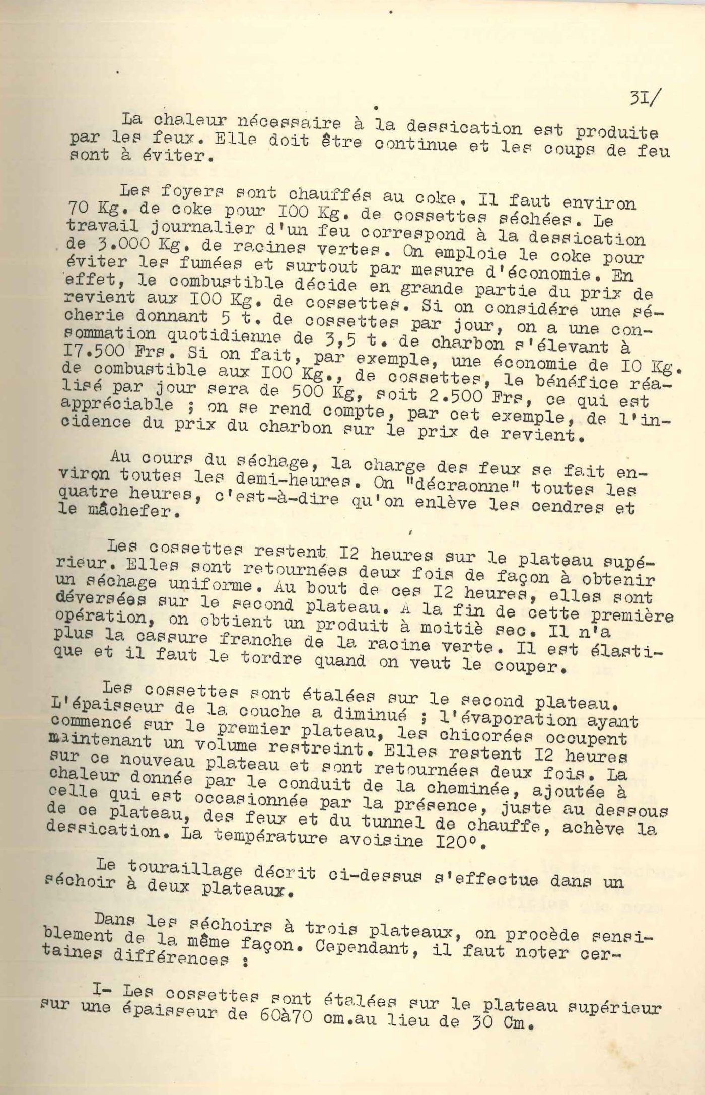 Deze studie is gemaakt door Mademoiselle Richalet in 1950. Ze beschrijft de verschillende processen van het drogen van de bonen op drie platen, evenals de droogtijden. Mevrouw Richalet beschrijft het stoken van de cokesvuren. Die produceren de warmte die nodig is voor het drogen van de bonen, zodat ze goed zouden bewaren. Ze praat over verschillende soorten cilinderdrogers in Frankrijk, Bohemen en Rusland.