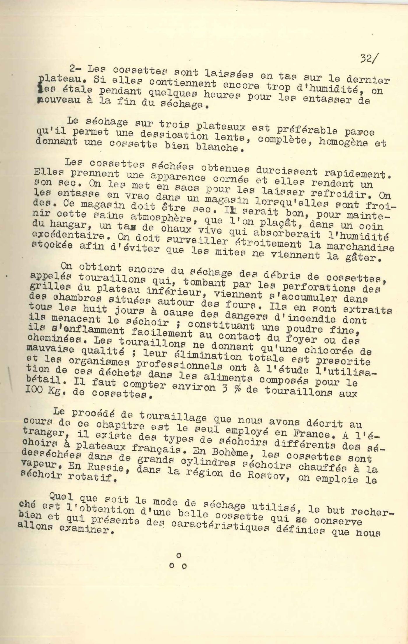 Ces fiches ont été créées par Mademoiselle Richalet en 1950. Elle y détaille les différents processus de séchage des cossettes sur trois plateaux ainsi que les temps de déshydratation. Mademoiselle Richalet décrit l'alimentation des foyers à coke produisant la chaleur nécessaire à la desiccation des cossettes, afin d'obtenir une bonne conservation du produit. Elle évoque différents types de séchoirs à cylindres en France, en Bohème et en Russie.