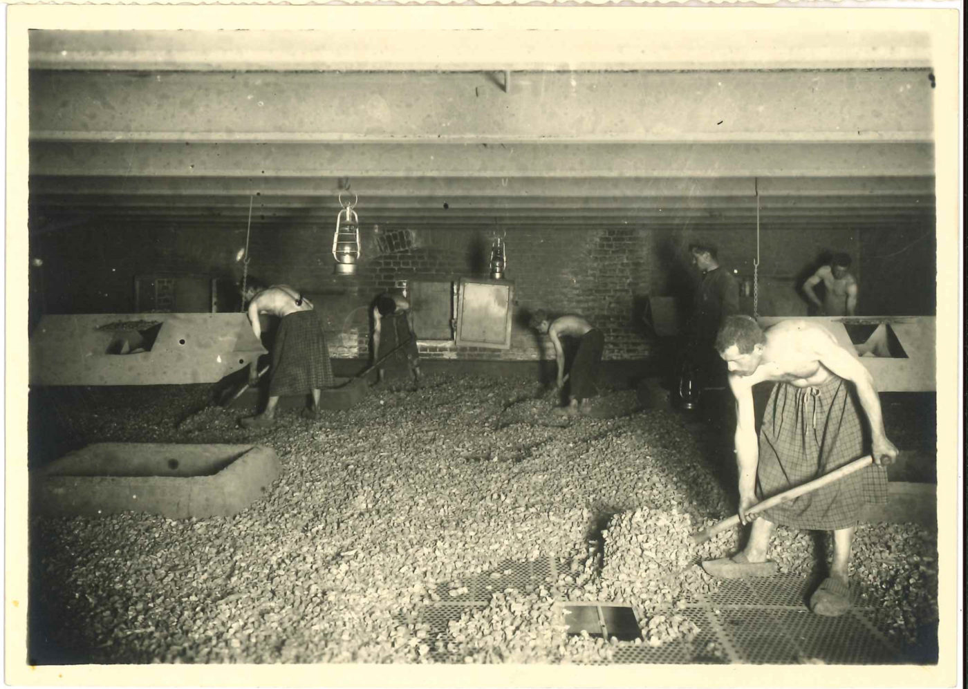 Une équipe d'ouvriers sécheurs vide la platine de cossettes après 24 heures de séchage et les fait descendre sur la platine en-dessous pour terminer le séchage.