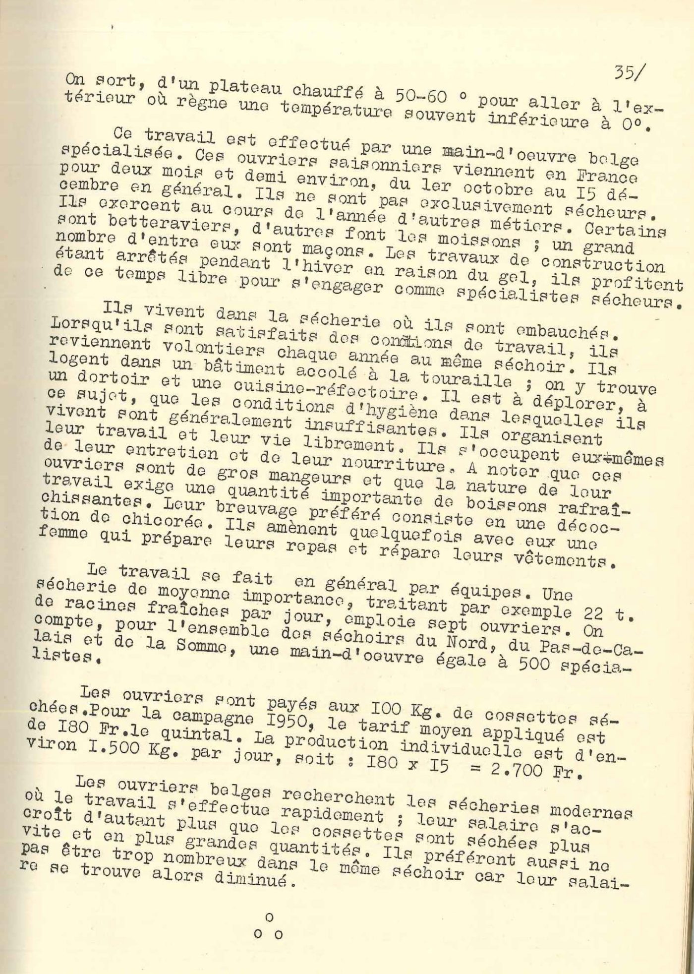 Le travail à la sécherie était extrêmement pénible. Il fallait une santé robuste pour supporter l'exposition aux vapeurs chaudes et aux gaz de combustion. Ce travail était effectué par une main d'oeuvre belge spécialisée. Ces travailleurs saisonniers travaillaient en équipe et ils étaient bien payés.