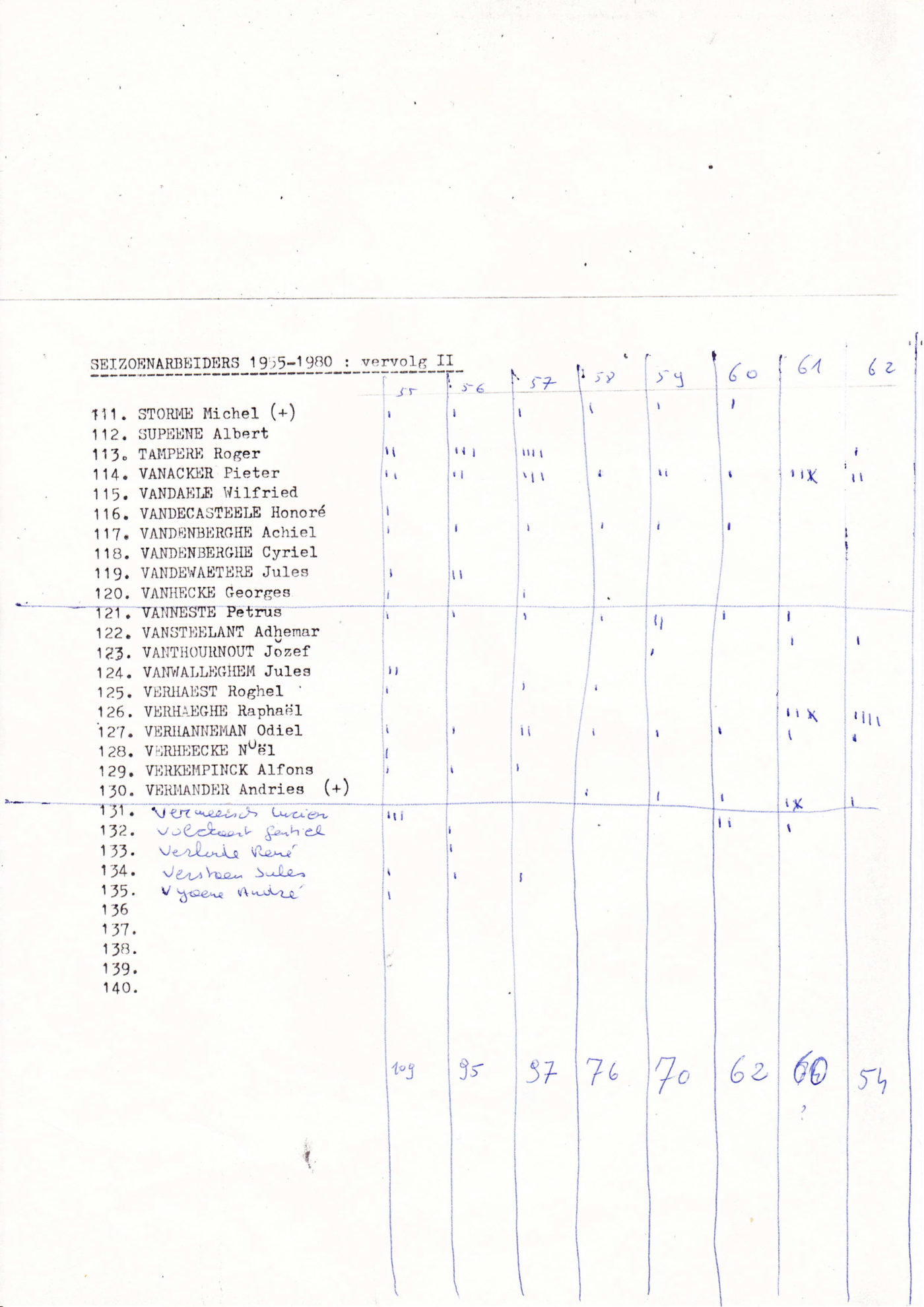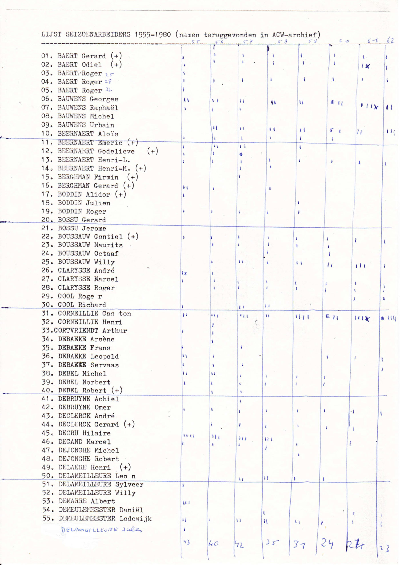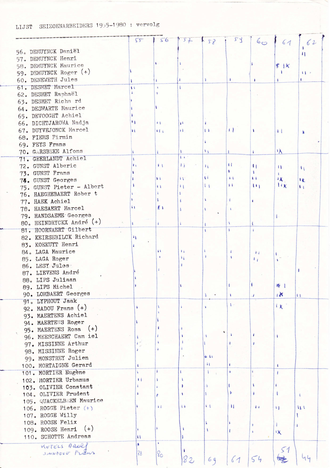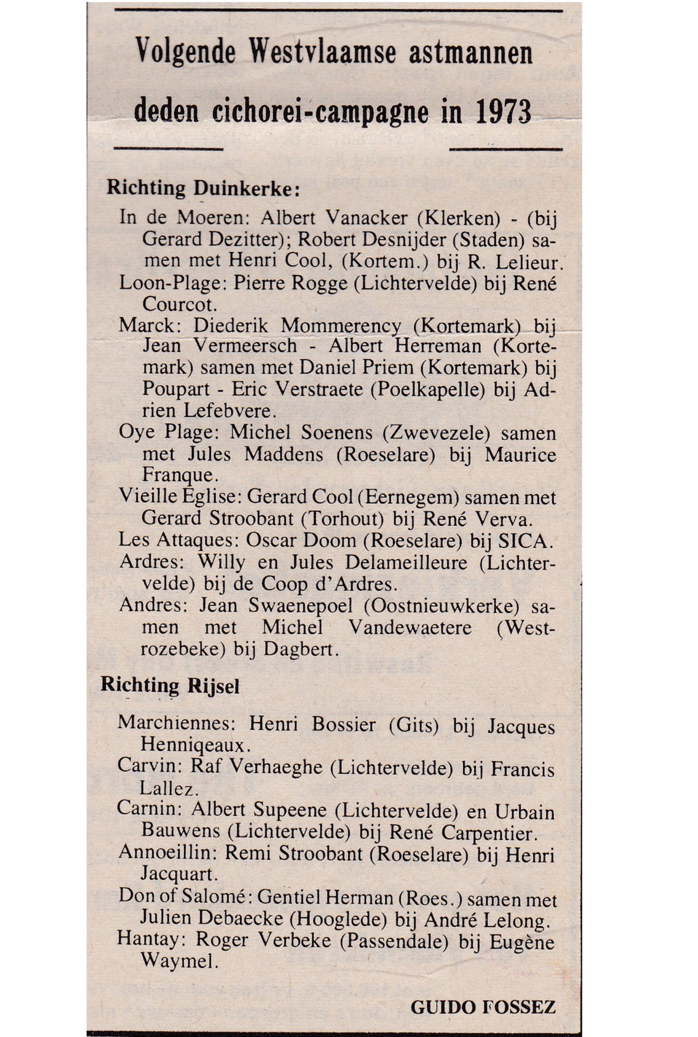 Liste des saisonniers de Lichtervelde qui ont travaillé en France entre 1955 et 1980. La liste a été établie par l'ACW. Le syndicat avait donc une idée précise de l'endroit où se trouvaient les hommes. Léon Bruggeman et Pastertje Joris De Jaeger ont régulièrement rendu visite à tous leurs amis en France. En cas de problème, ils ont joué le rôle de médiateurs entre le patron et les travailleurs.