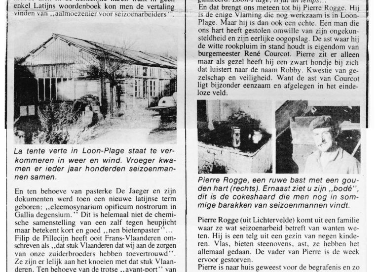Als je een seizoenarbeider tegenkomt, moet je hem zeker over Loon-Plage spreken. Je zult merken dat zijn ogen beginnen te blinken en hij zal mijmeren. Loon-Plage is in het grote verhalenboek van cichorei een fascinerend hoofdstuk op zichzelf . (Guido Fossez)